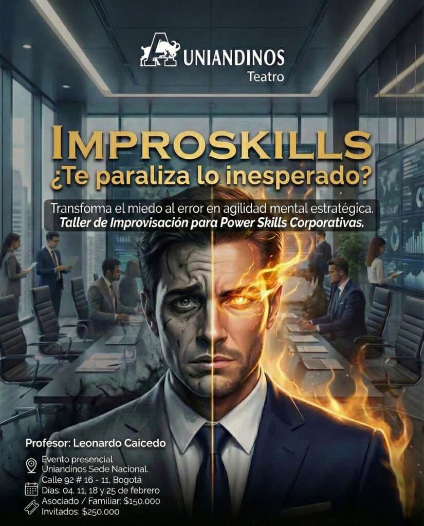 Profesor: Leonardo Caicedo, Doctor en Estudios Teatrales con más de 10 años de experiencia en entrenamiento y formación en improvisación teatral (IMPRO). Ha liderado proyectos en Colombia y Europa, representando al país en festivales internacionales. Su enfoque integra la metodología actoral con el fortalecimiento de competencias corporativas como la creatividad, la adaptabilidad, el trabajo en equipo y el liderazgo. Especializado en potenciar la agilidad mental y las habilidades comunicativas aplicada al éxito profesional.